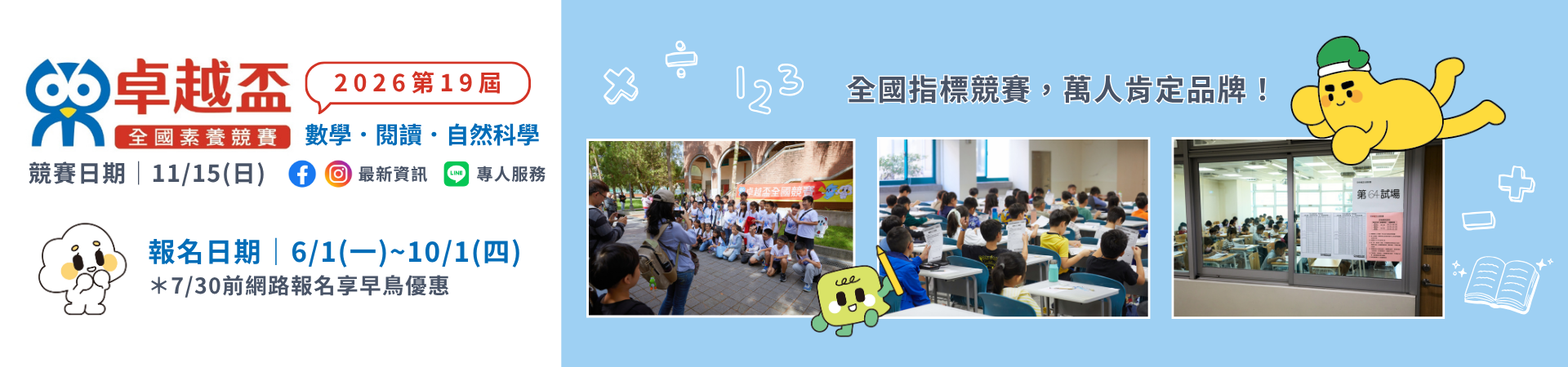 財團法人康軒文教基金會自2008年起開辦卓越盃數學及閱讀 競賽,本賽事是為國小一年至七年級學生舉行的大型競賽。 是現行公開舉辦的國小數學及閱讀賽事中, 歷史最悠久、參加人數最多的指標性競賽!